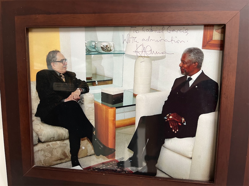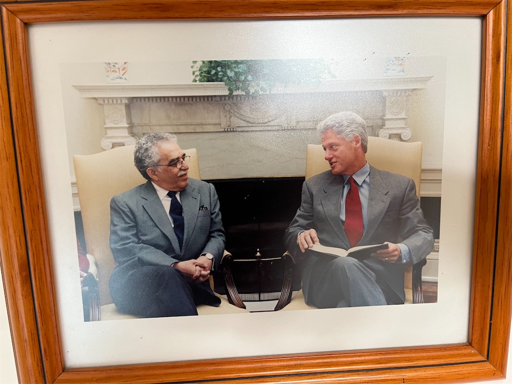 本棚には他に、彼がノーベル文学賞を受賞したときの写真、そしてアルゼンチンの作家ルイス・ボルヘスの写真も飾られていた。